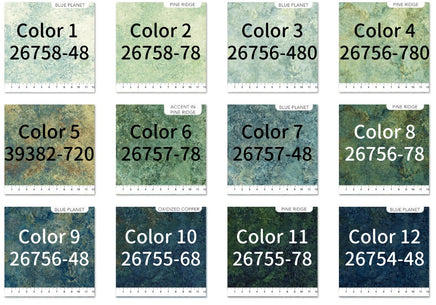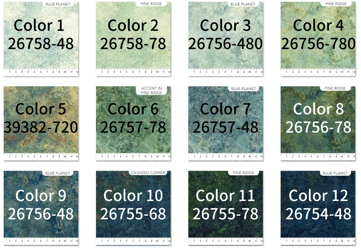 Misted Pines 2.0 uses the latest release from the Stonehenge Gradations collection by By Linda Ludovico and Deborah Edwards for Northcott Fabrics. Experience the stunning blend of colors that replicates the exquisite patterns found in natural granite stone! There are 12 Stonehenge colors in this kit... each only slightly lighter or darker then the next... we have put together some labels to help keep your colors straight.