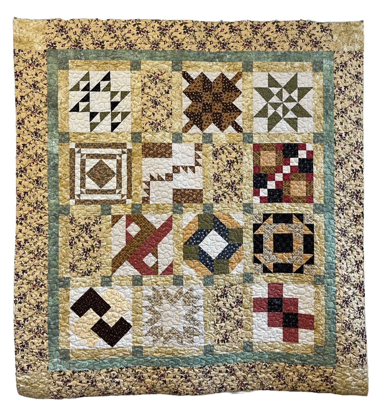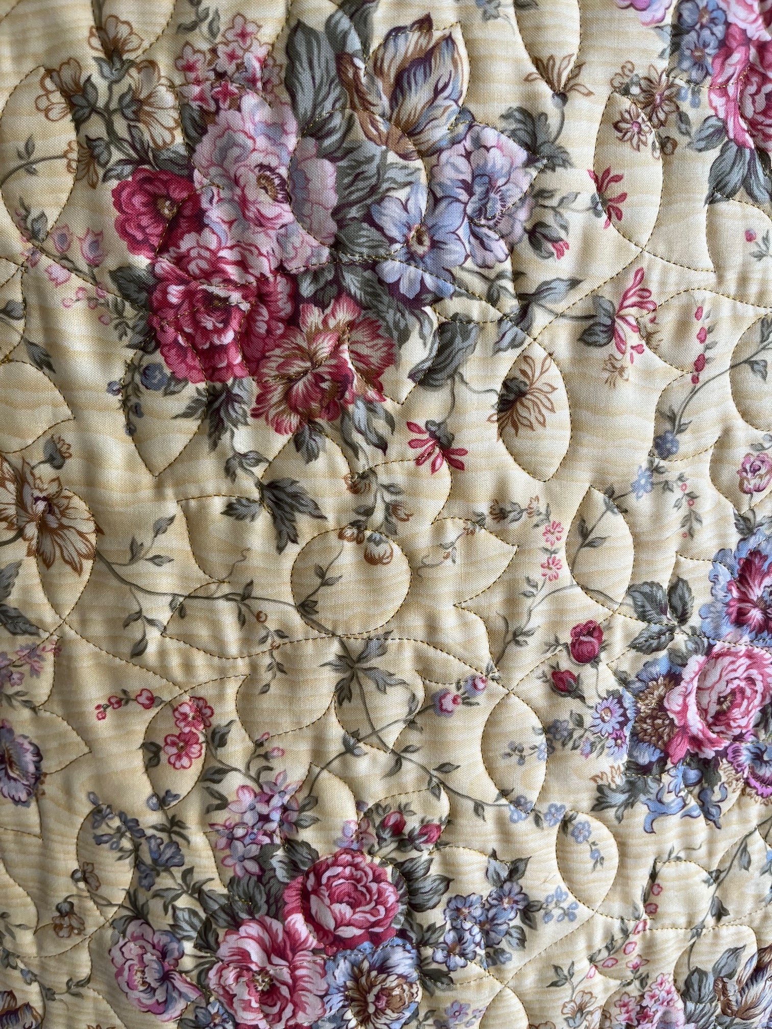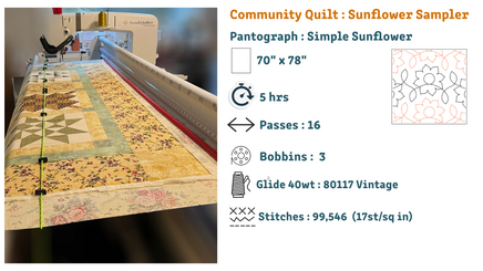 This charming quilt was quilted for the  Niagara Heritage Quilters Guild, Community Quilts Program. When it came to me the tag indicated "Pieced By : Found". What a lovely quilt and I wonder who found it and where. The tone of the yellow and the teal are so bright and cheery and I hope will bring comfort to someone soon. The yellow/brown in the quilt made me think of sunflowers... hence the title "Sunflower Sampler" and the pantograph "Simple Sunflower"