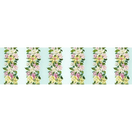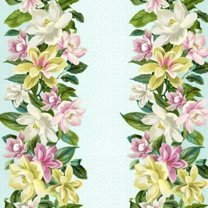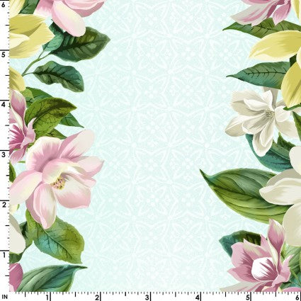 Maywood Lanai... a stunning design with its tropical florals on a lovely light blue (water) color background. The vertical repeat is ~7" (there are 6 repeats in the width)