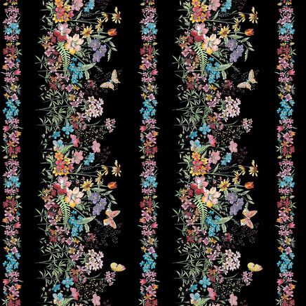 Meadows Edge stripe is a stunning design with its pastel florals against a dramatic black background. The Vertical repeat is ~10" . Pair this with the 27" panel for a quick beautiful look. Click here to see the coordinating panel