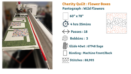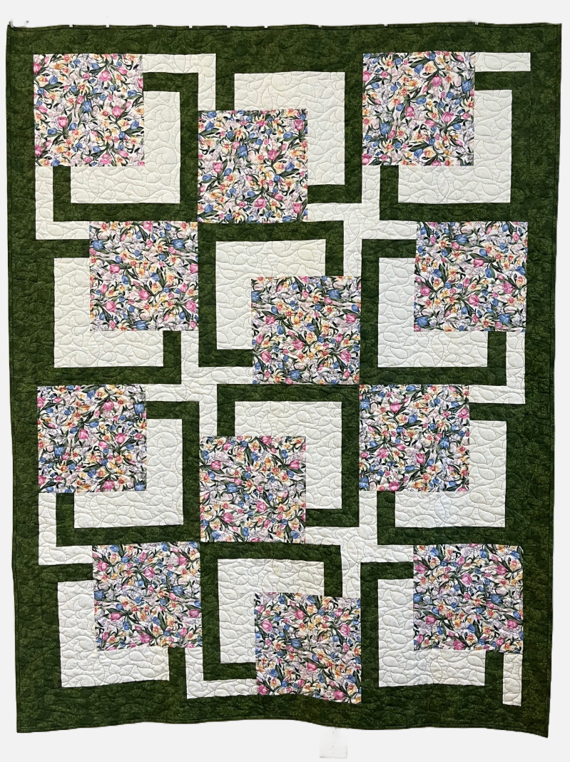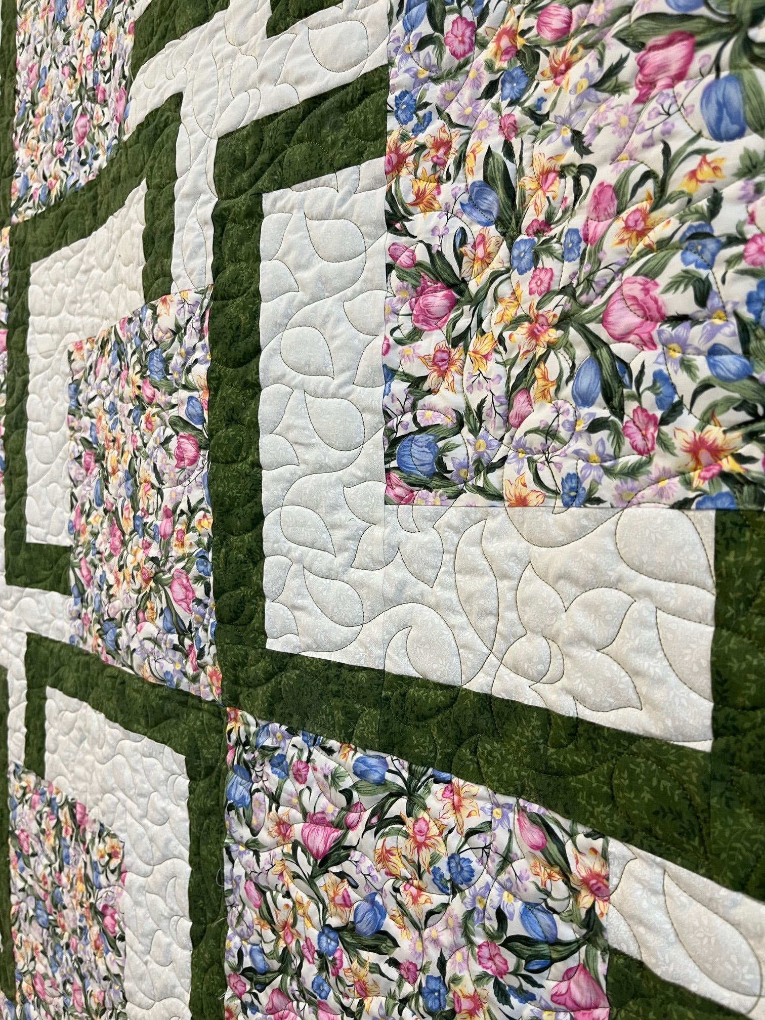 This quilt was pieced by the Niagara Heritage Quilters Guild for their Giving Back Program. It is a lovely quilt with spring like happy flowers. The pantograph is Wild Flower.