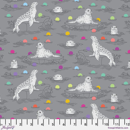 "Graywork began as a collection of all gray prints and slowly blossomed to include touches of color to spice things up. I focused on animals that live their lives in shades of gray; Wolves, Bears, Snow Leopards, Puffins and Sea Lions. These eight prints are big and illustrative, packed with details designed for fussy cutting as the stars of the show." Tula Pink