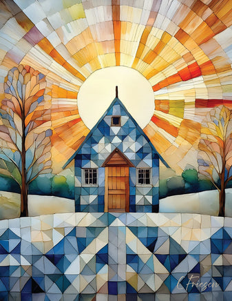Indigo Cabin is part of the Quilted Cabins I collection of art prints and greeting cards. The artwork combines watercolor paints and digital tools, resulting in Quiltberry Farm's signature quiltscape cubist style. This card is a folded A2 size, measuring 4.25 wide and 5.5 tall, printed on quality 100 lb cover stock. Matching envelopes are included.