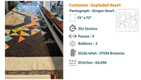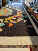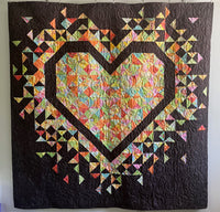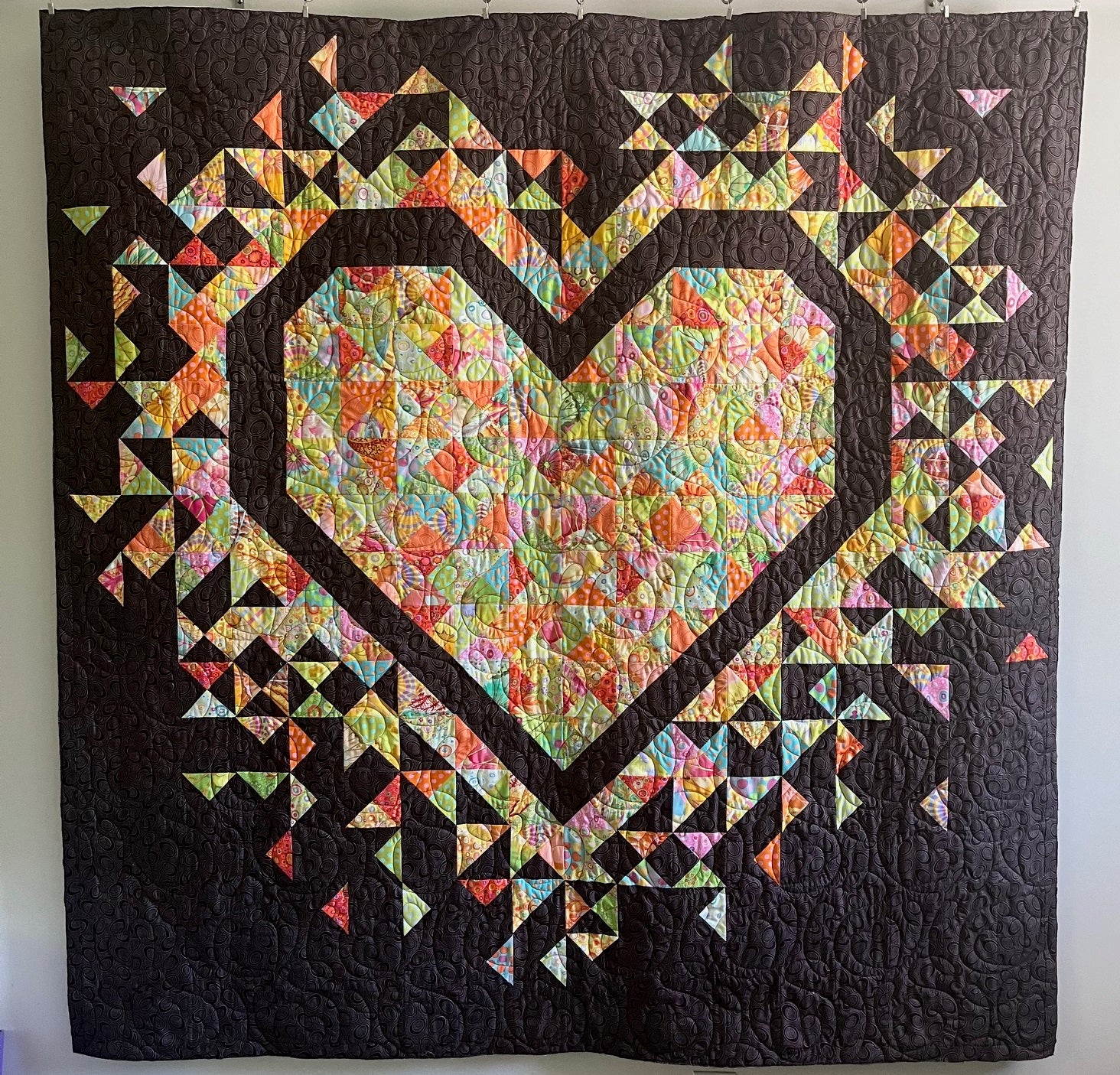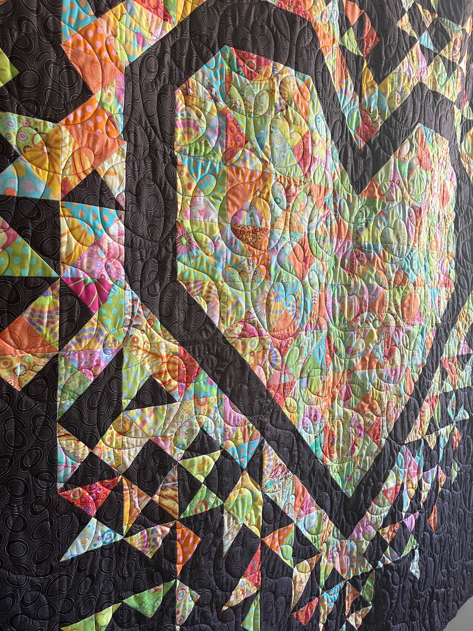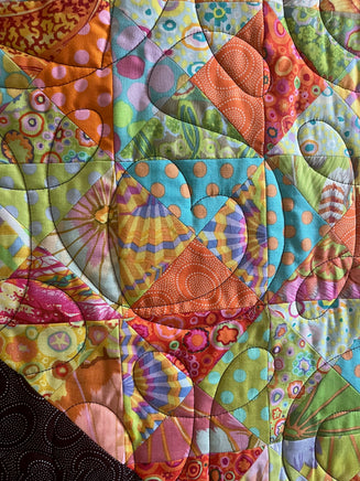 This quilt was beautifully pieced by KP. The pattern is Exploding Heart (from Slice of Pi Quilting). The fabric is used is all from Kaffe Fassett. It was quilting using the