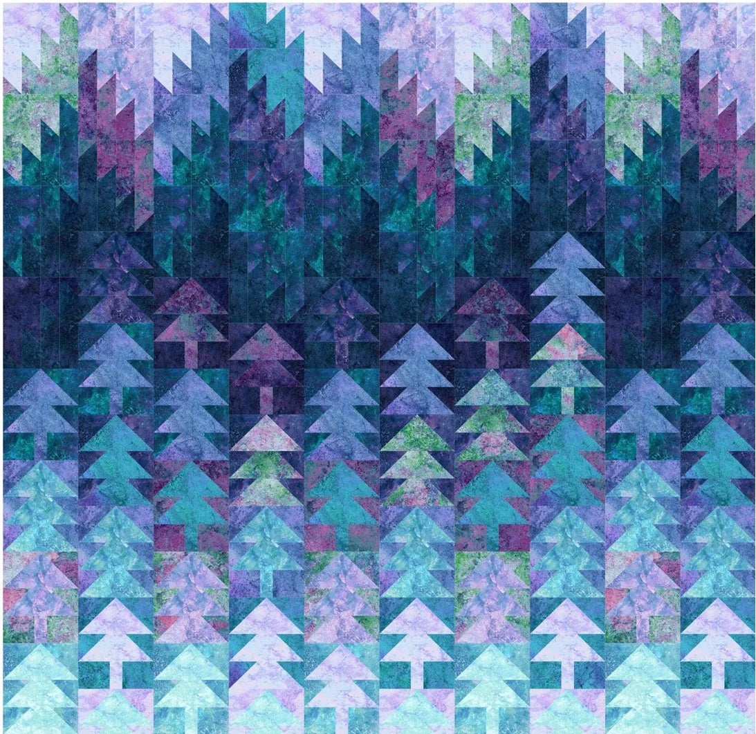 Misted Pines 2.0 uses the latest release from the Stonehenge Gradations collection by By Linda Ludovico and Deborah Edwards for Northcott Fabrics. Experience the stunning blend of colors that replicates the exquisite patterns found in natural granite stone! There are 12 Stonehenge colors in this kit... each only slightly lighter or darker then the next... we have put together some labels to help keep your colors straight.