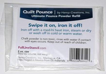 Ulitmate White Pounce Chalk Refills come in an easy to use, zip bag. Just remove the plug and pour into the reservoir. Easily washes off with water. Keep from direct heat or sunlight. Ultimate Iron Off 2 oz- White, Just pounce on powder, then iron it off! This powder stays put, no more bouncing.